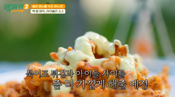 특제 아이올리 소스는 북어포 튀김과 완벽한 조화를 이루는 특별한 소스입니다. 백종원의 마법으로 맛을 한층 더 풍부하게 만들어 북어포 튀김을 더욱 특별한 요리로 변신시켰습니다. 다른 튀김 종류와도 잘 어울릴 듯하니 응용하시면 좋을 것 같네요.