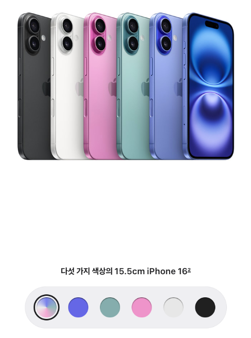 - 아이폰 16 : 블랙, 그린, 옐로우, 핑크, 화이트