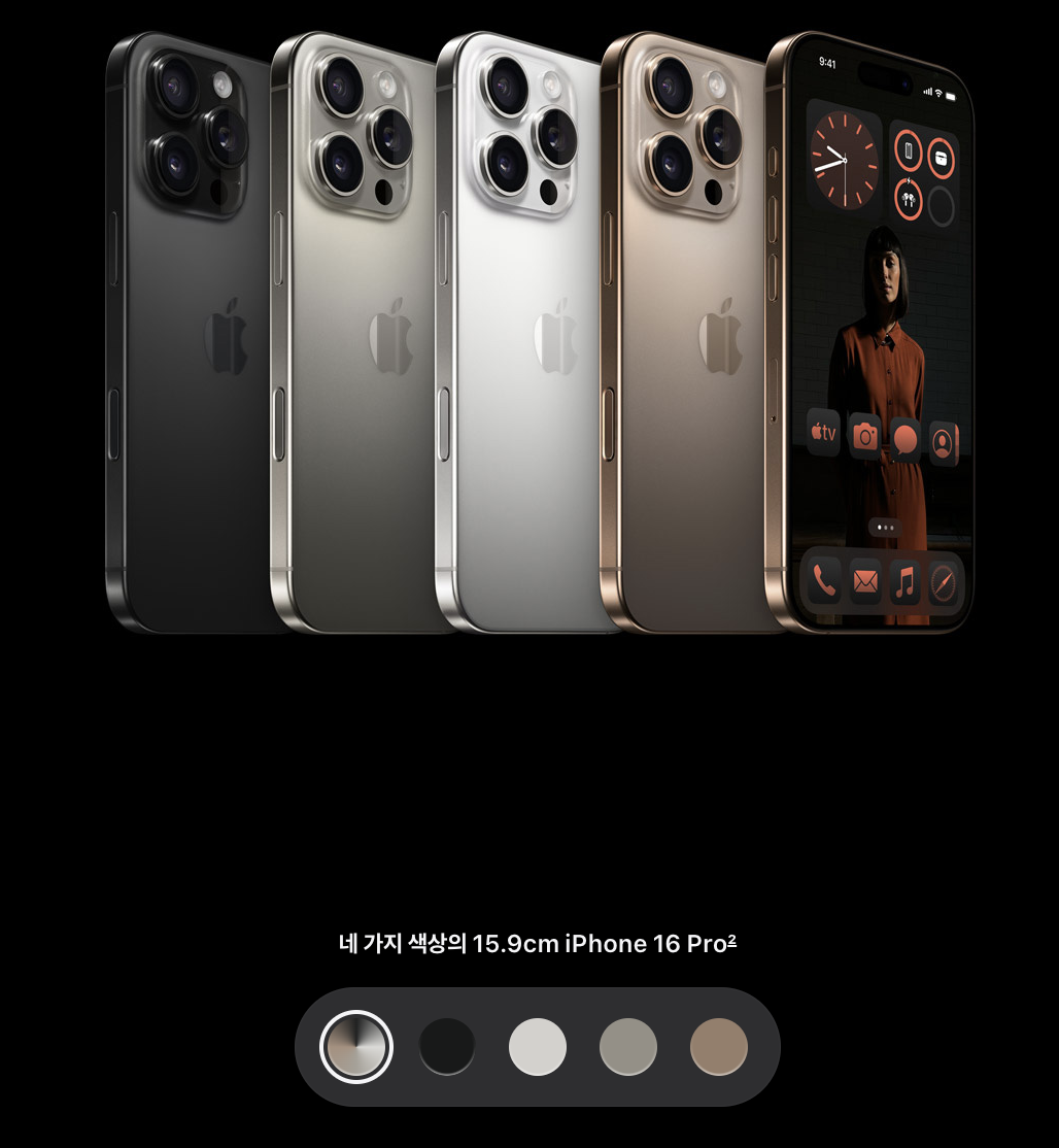 - 아이폰 16 프로 : 블랙 티타늄, 화이트 티타늄, 내추럴 티타늄, 데저트 티타늄 (새롭게 추가된 색상)