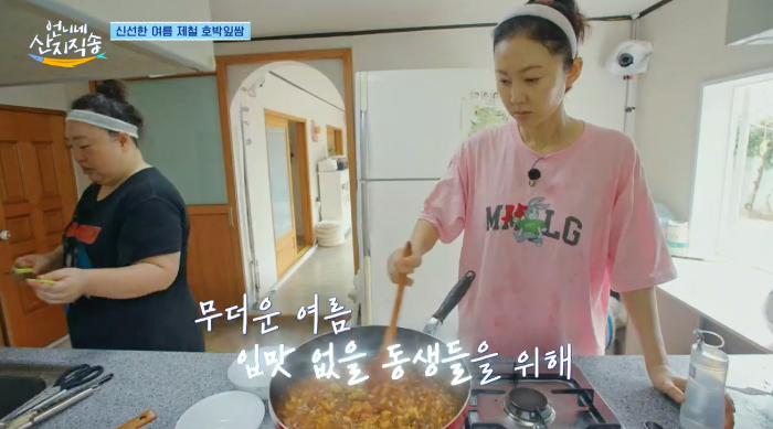 큰 손 언니 염정아 씨가 동생들을 위해 강된장을 만들고 있습니다.