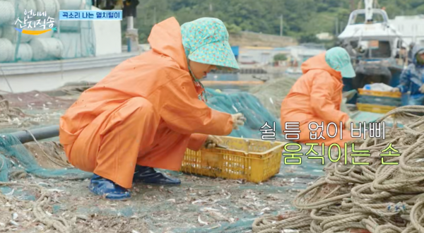 네 사람은 직접 멸치를 잡고 멸치털이를 하면서 고된 과정을 몸소 느끼게 되는데 그런 후 신선한 멸치로 멸치튀김과 멸치구이를 만들어 첫 끼를 준비합니다. 말로 표현할 수 없을 정도로 특별한 맛.