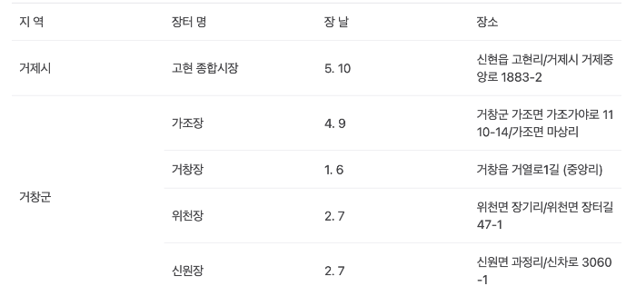 아래는 거제 근처의 오일장 날짜와 위치 정보입니다.