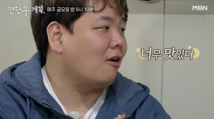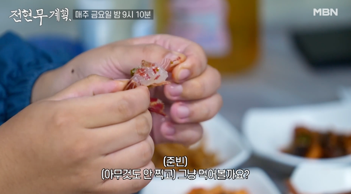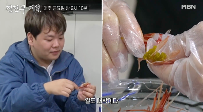 곽튜브는 용기 있게 꽃새우, 닭새우 회를 차례대로 맛본 후에 "너무 맛있다"라고 감탄합니다.