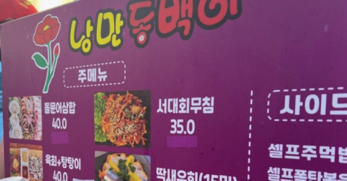 낭만동백이는 낭만포차거리의 끝부분에 위치하고 있어서 바다뷰를 감상하면서 돌문어삼합과, 서대회무침, 딱새우 등 다양한 해산물 요리를 즐길 수 있습니다.