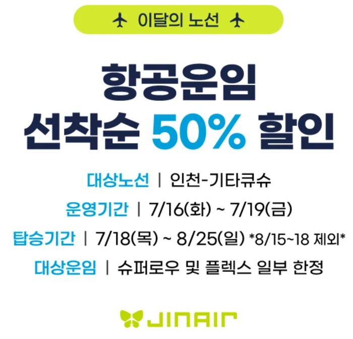 진에어는 다양한 혜택으로 이달의 노선은 선착순으로 50%나 할인을 해준다고 해요.