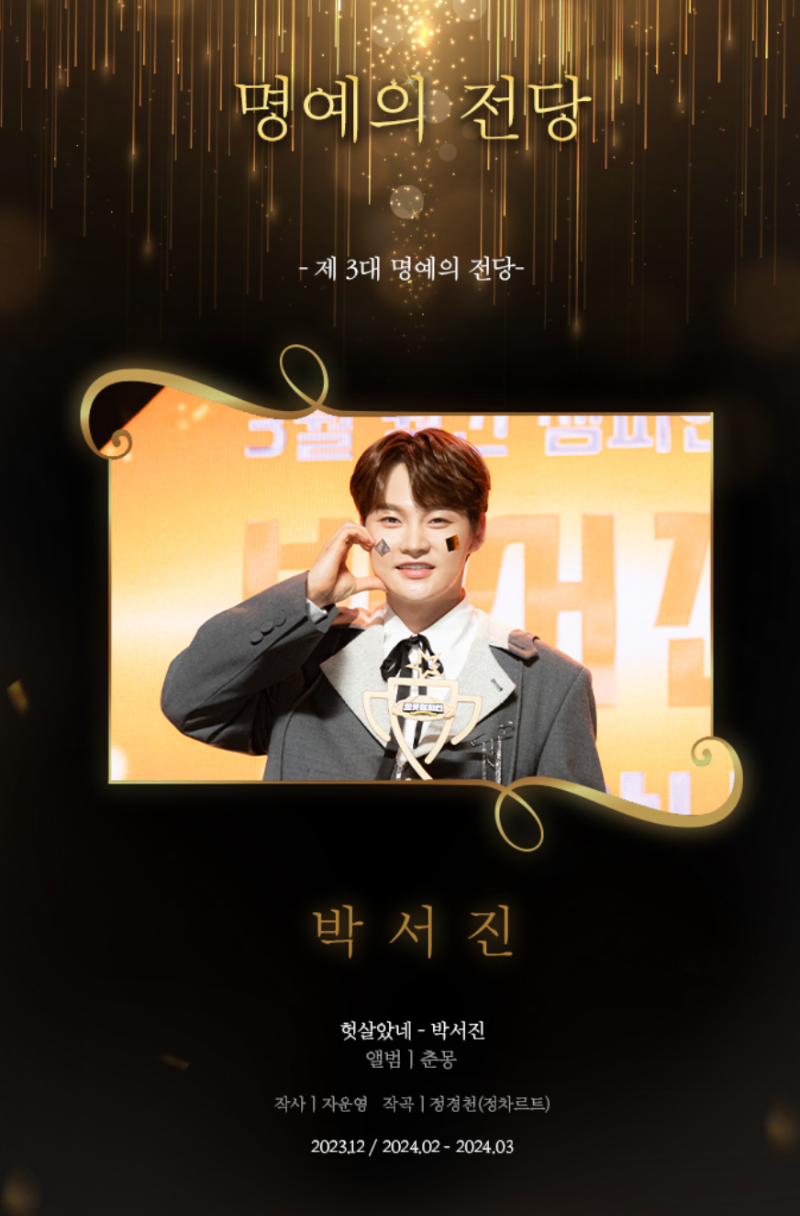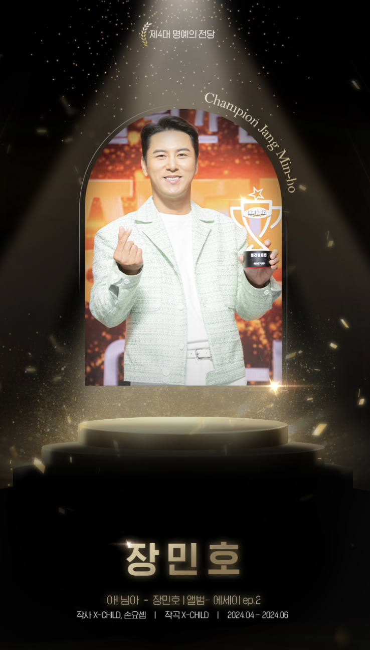 잠깐 돌아보자면 박서진은 2023년 12월부터 2024년 2월 그리고 3월에 '헛살았네'로 제3대 명예의 전당에 올랐습니다. 그리고 장민호는 올해 4월부터 6월까지 3 연속 월간 챔피언으로 제4대 명예의 전당에 올랐습니다.